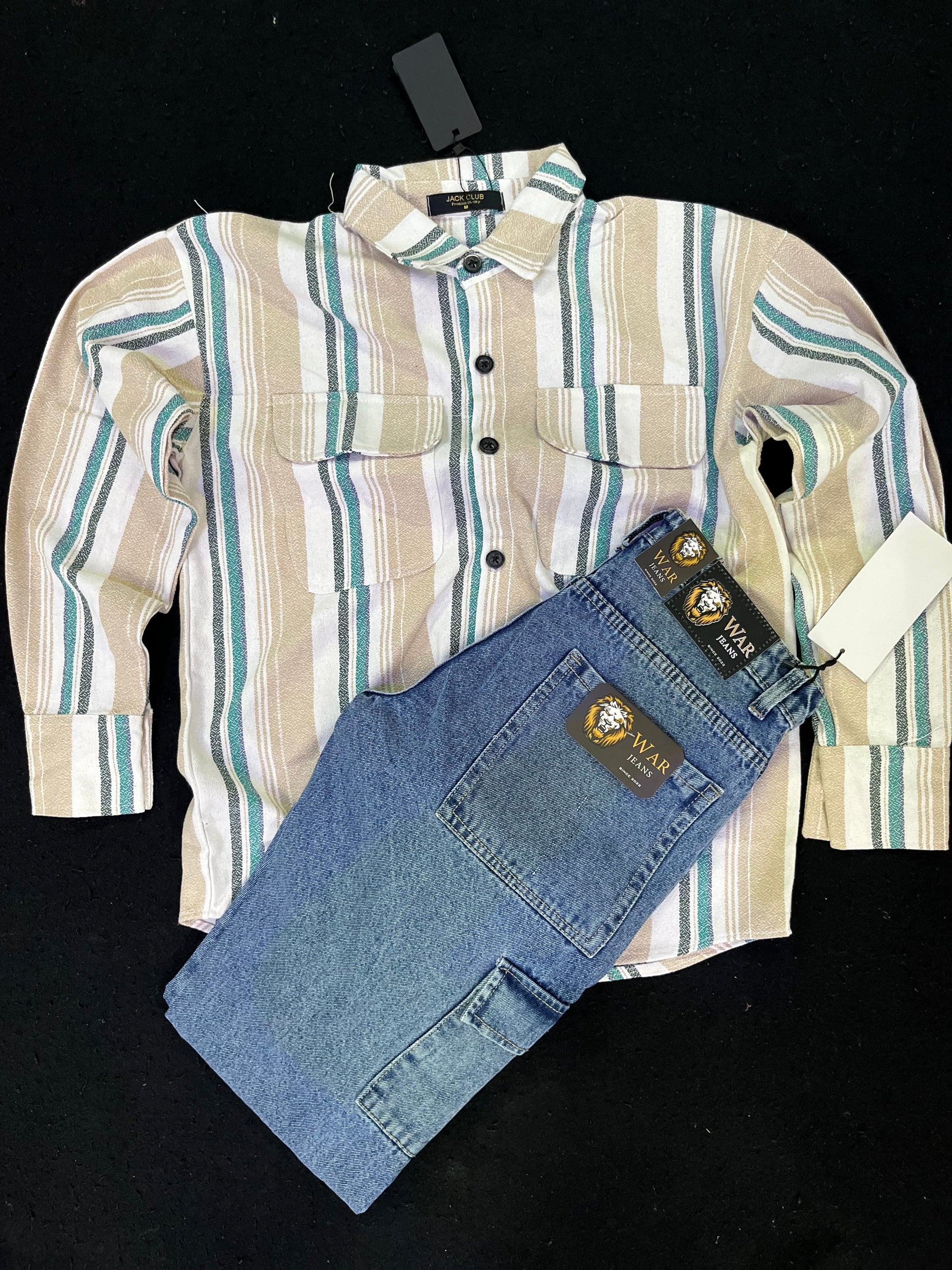 Folded and placed over the bottom of the shirt is a pair of dark wash denim jeans (or possibly black/charcoal denim). Like the previous image, these jeans feature a distinctive large, angular flap pocket on the thigh, suggesting a cargo or utility style. A price tag or brand tag is visible tucked into the denim fold.